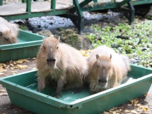 カピバラは水が好きで、皮膚の清潔を保ち健康でいるためにも時々水に入る必要があるそうです。南米出身の動物のため、冬の間は温かいお風呂が用意されています。